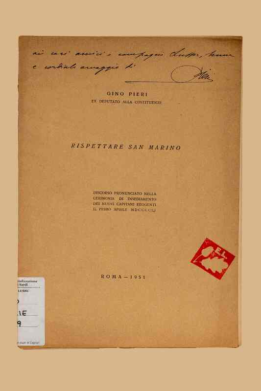 - Rispettare San Marino : discorso pronunciato nella cerimonia di insediamento dei nuovi Capitani reggenti, il 1 aprile 1951 / Gino Pieri. - Roma : [s.n.], 1951. - 15 p. ; 22 cm.