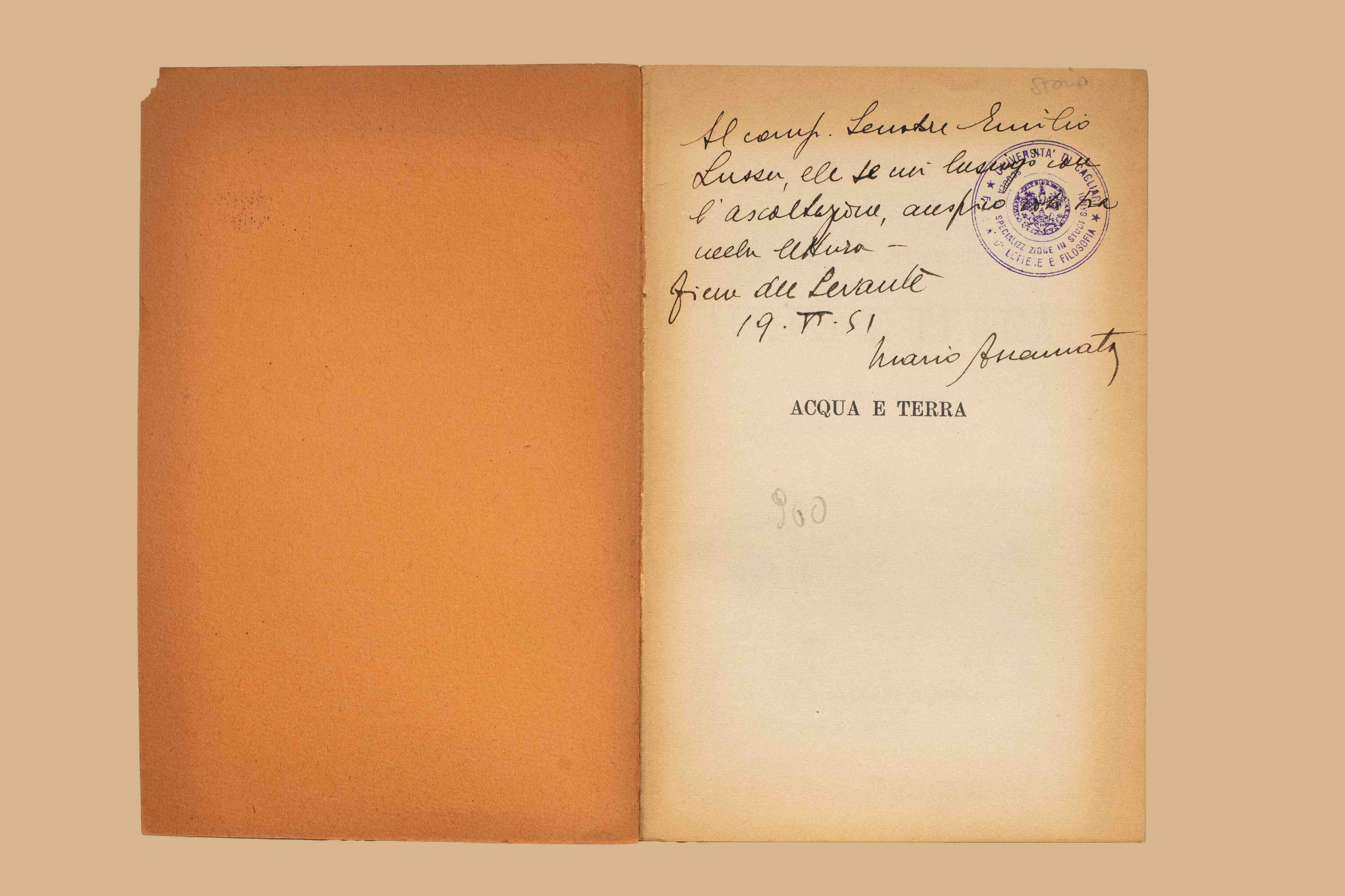 - Nell'occhietto dedica ms. “al comp. Senatore Emilio Lussu, che mi lusingò con l'ascoltazione ... Fiera del Levante, 19.2.51, Mario Assennato”.