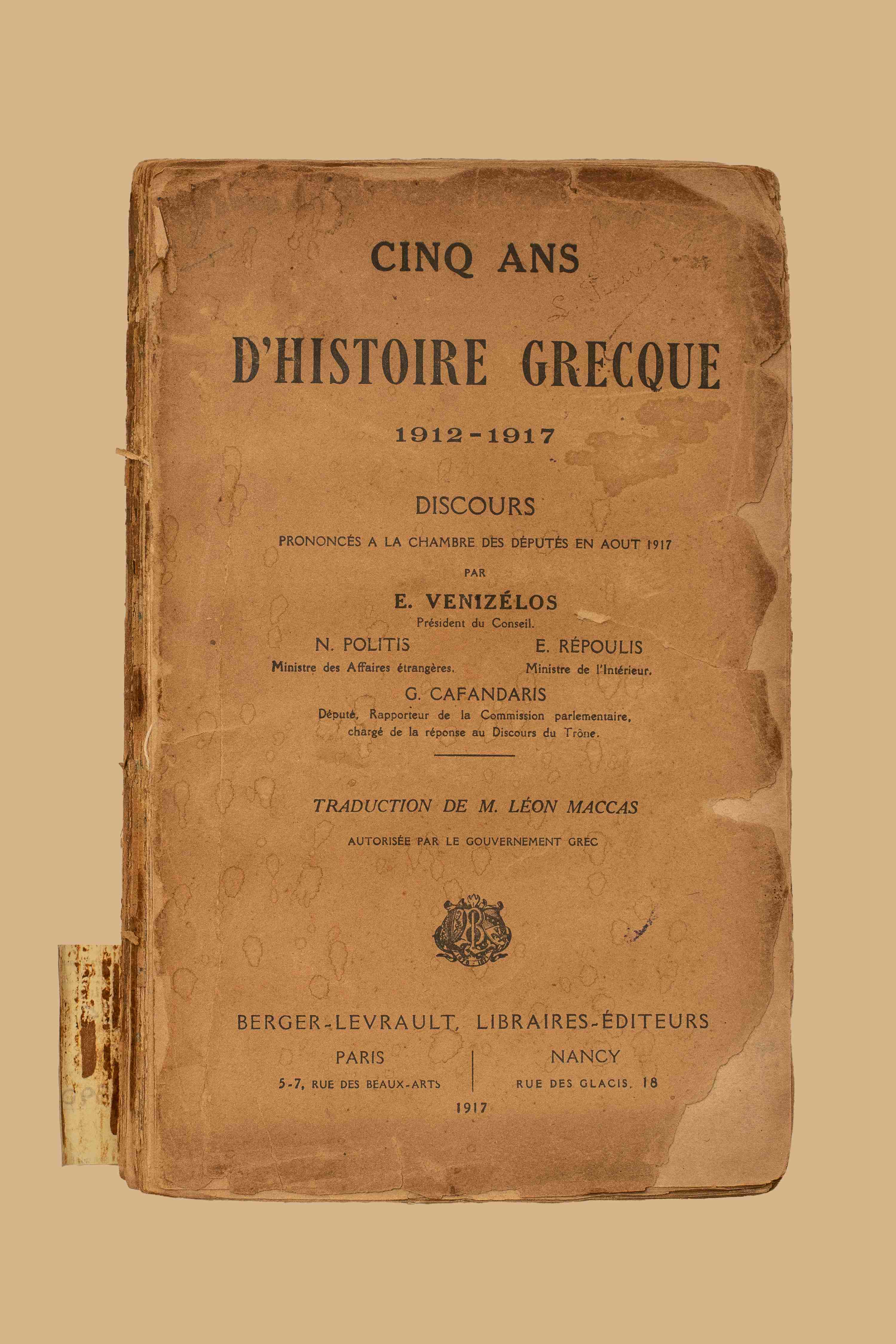 Titolo: Cinq ans d'histoire grecque, 1912-1917; discours prononcés à la chambre des députés en août 1917 / par E. Venizelos ... [et al.] ; traduction de M. Leon Maccas autorisée par le gouvernement grec. - Paris : Nancy, Berger-Levrault, 1917. - VII, 247 p. ; 23 cm.